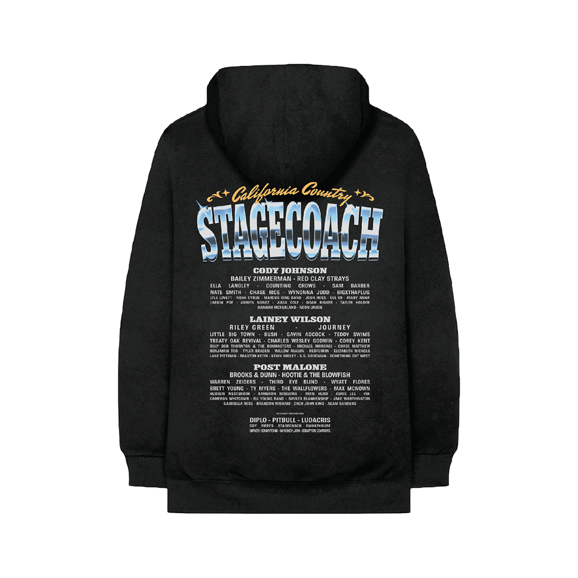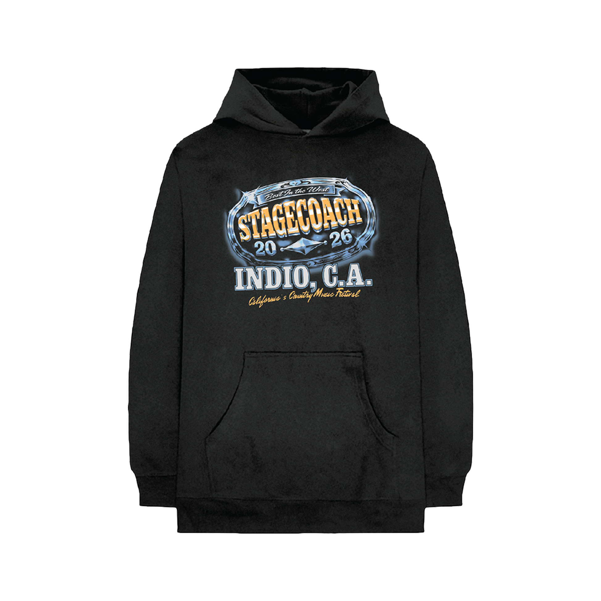 Heavyweight hoodie in black, featuring Buckle Up logo art printed on the front and the 2026 Stagecoach lineup printed on the back. 80/20 cotton/polyester. Unisex, relaxed fit.